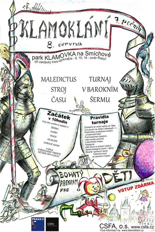 Den věnovaný šermířskému umění a půvabům dávné historie. Uvidíte turnaj v barokním šermu, vojenské ležení, známé české šermíře, tanečnice, kejklíře, muzikanty, divadelníky, kaskadéry, ... Historický jarmark s čajovnou, lazebnou i kartářkou. Pro naše nejmenší je připraven bohatý dětský program. A koho zajímá mystika a obzvlášť cestování časem, rozhodně by si neměl nechat ujít večerní akční show zakončující letošní Klamoklání. » Pokračování »